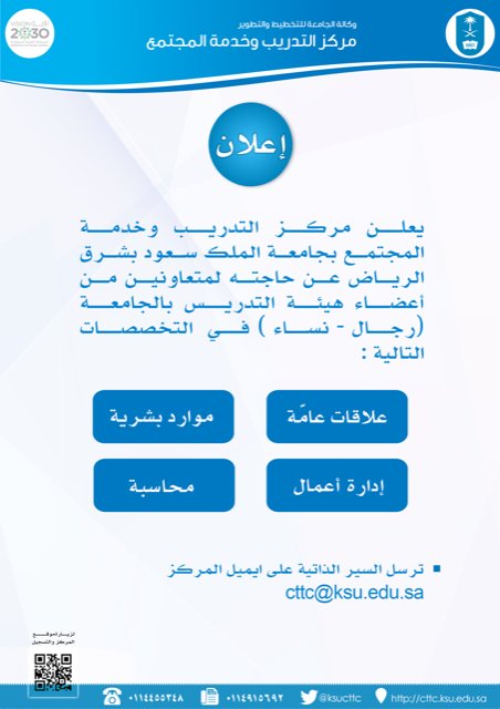 أعلنت جامعة الملك سعود ممثلة بمركز التدريب وخدمة المجتمع عن حاجته لمتعاونين من أعضاء هيئة التدريس بالجامعة للرجال والنساء، في التخصصات التالية (علاقات عامة، وموارد بشرية، وإدارة الأعمال، والمحاسبة)، وذلك وفقاً لطريقة التقديم الموضحة أدناه.