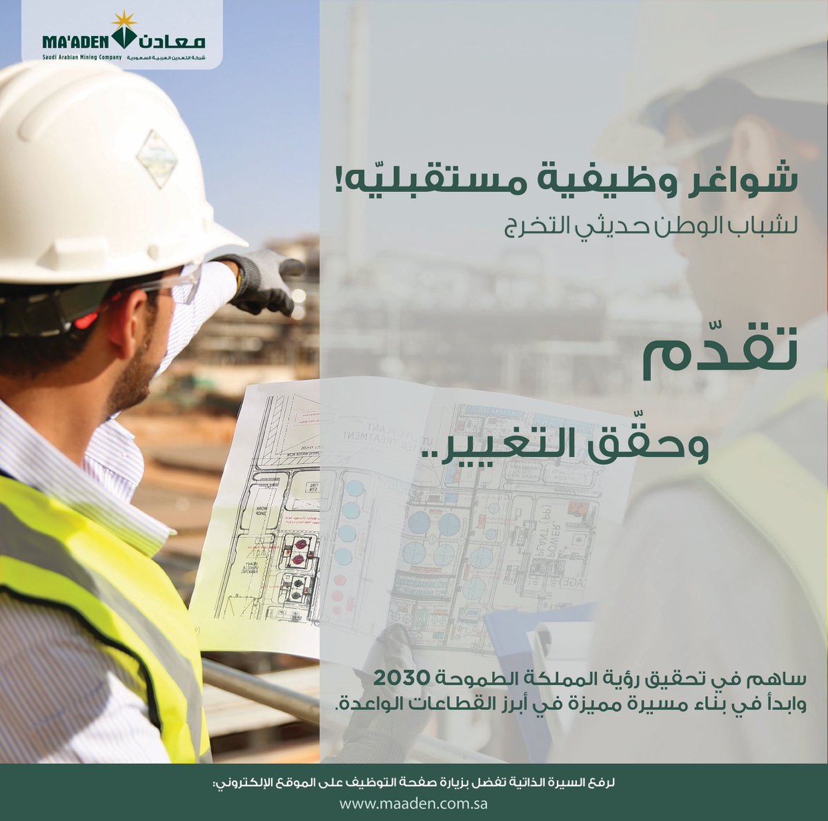 شركة التعدين العربية السعودية (معادن) تعلن عبر موقعها الإلكتروني (بوابة التوظيف) فتح باب طلبات التوظيف للشواغر المستقبلية لحديثي التخرج من حملة الشهادة الجامعية (البكالوريوس) في جميع التخصصات الإدارية والتقنية والهندسية