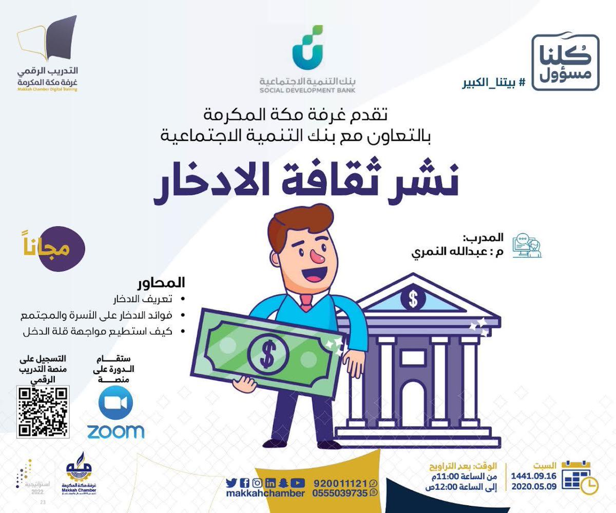 غرفة مكة المكرمة اعلنت عن إقامة دورة مجانية عن بعد بالتعاون مع بنك التنمية الاجتماعية، بعنوان (نشر ثقافة الإدخار)، وذلك حسب التفاصيل والشروط والمعلومات الواردة بالاعلان ادناه عبر موقع وظائف المواطن :-