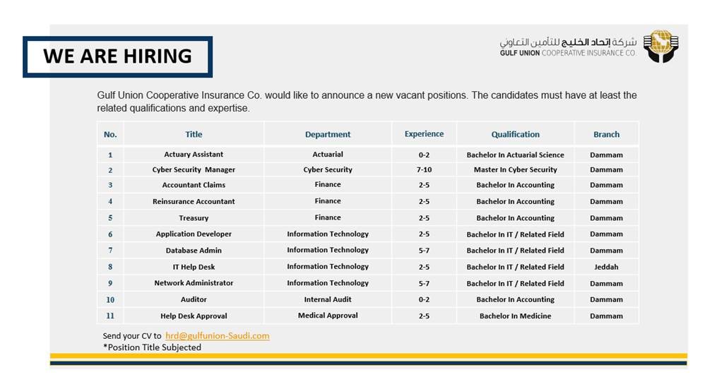 شركة إتحاد الخليج للتأمين التعاوني اعلنت عن توفر وظائف شاغرة عدد 15 وظيفة ادارية وتقنية للعمل في مناطق الدمام وجدة وذلك وفق التفاصيل الموضحة ادناه :