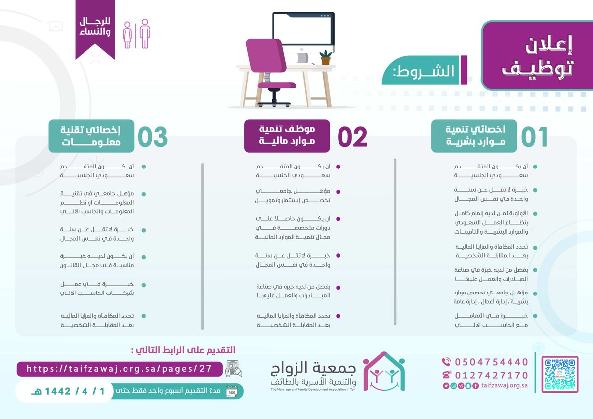 جمعية الزواج والتنمية الأسرية اعلنت عن توفر وظائف ادارية للرجال والنساء للعمل بالطائف وذلك وفق التفاصيل الموضحة ادناه :