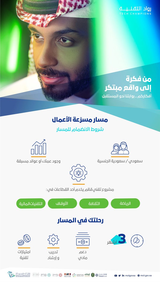 وزارة الاتصالات وتقنية المعلومات اعلنت عن بدء التقديم في برنامج رواد التقنية 2021 م عبر مسار مسرعة الأعمال ومسار حاضنة الأعمال يقام البرنامج عن بعد وذلك وفق التعليمات والمعلومات والتفاصيل الموضحة ادناه :