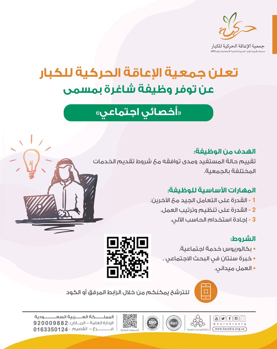 وظائف جمعية الإعاقة الحركية للكبار بمجال البحث الاجتماعي بالرياض