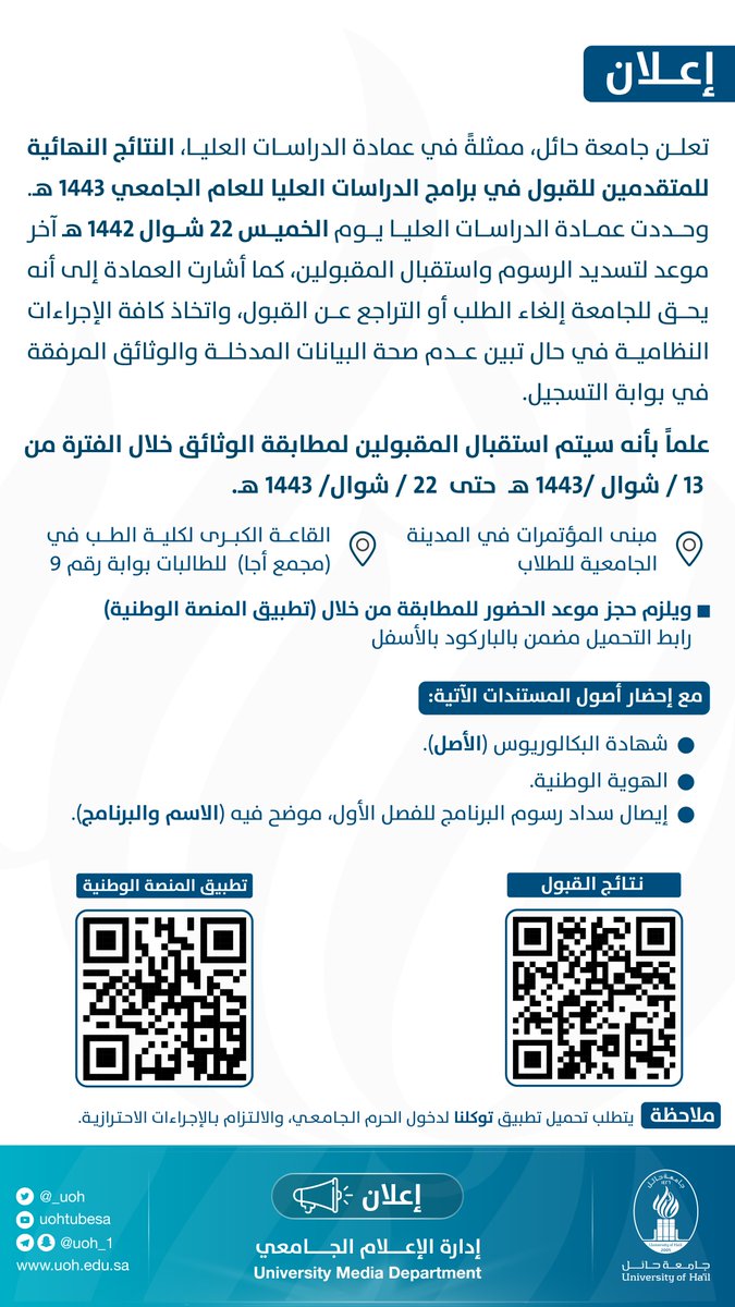 جامعة حائل ممثلة في عمادة الدراسات العليا، النتائج النهائية للمتقدمين للقبول في برامج الدراسات العليا للعام الجامعي 1443هـ 21 يوليو 2021عبر موقع الجامعة الإلكتروني وحدد يوم الخميس 22 - شوال 1442هـ اخر يوم لتسديد الرسوم واستقبال المقبولين وذلك وفق التعليمات والمعلومات والتفاصيل الموضحة ادناه :
