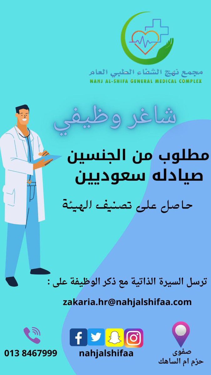 مجمع نهج الشفاء الطبي العام اعلن عبر حسابها الالكتروني بتويتر عن توفر وظائف صحية للرجال والنساء من اجل العمل بصفوى المنطقة الشرقية (الوظيفة للسعوديين) وذلك وفق التعليمات والمعلومات والتفاصيل الموضحة ادناه :