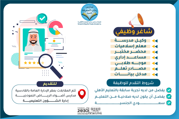 مدارس رحاب المعرفة الأهلية اعلنت عن توفر وظائف تعليمية وإدارية شاغرة للعمل بمدينة الرياض وذلك وفق المعلومات والتفاصيل المدونة والموضحة بموقع وظائف المواطن ادناه :