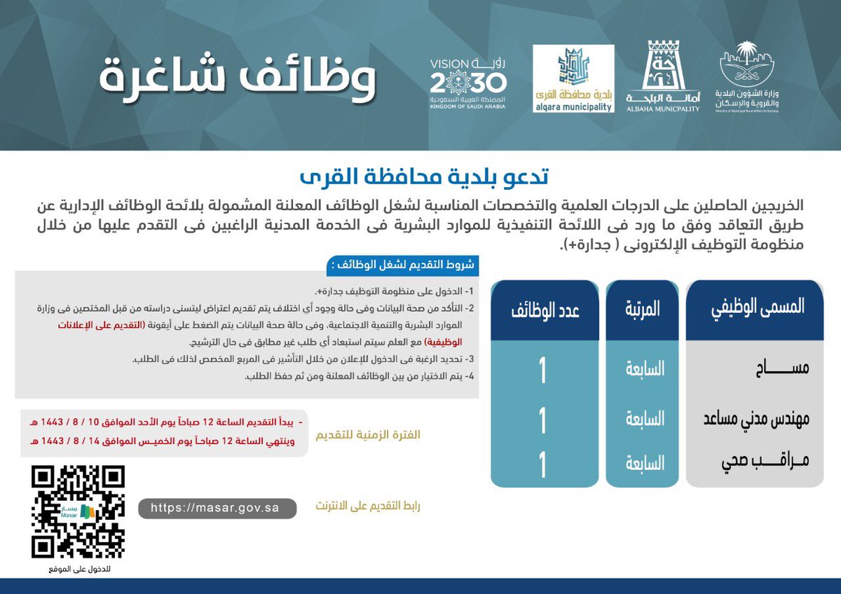 أمانة منطقة الباحة اعلنت عن توفر عدد 22 وظيفة هندسية وتقنية ومراقبين شاغرة بالمرتبة السابعة عبر بوابة جدارة وتدعو الخريجين الحاصلين على الدرجات العلمية والتخصصات المناسبة لشغل الوظائف المعلنة المشمولة بلائحة الوظائف الإدارية عن طريق التعاقد وفق ما ورد في اللائحة التنفيذية للموارد البشرية في الخدمة المدنية الراغبين في التقدم عليها من خلال منظومة التوظيف الإلكتروني (جدارة+) وذلك حسب التفاصيل المدونة أدناه :