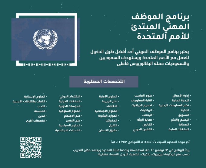 مؤسسة مسك الخيرية بالشراكة مع الأمم المتحدة تعلن عن فرصة الزمالة من خلال برنامج الموظف المهني المبتدئ للأمم المتحدة، ويعتبر برنامج الموظف المهني أحد أفضل طرق الدخول للعمل مع الأمم المتحدة وذلك وفق التفاصيل والشروط والمعلومات الواردة بالاعلان ادناه عبر موقع وظائف المواطن :-
