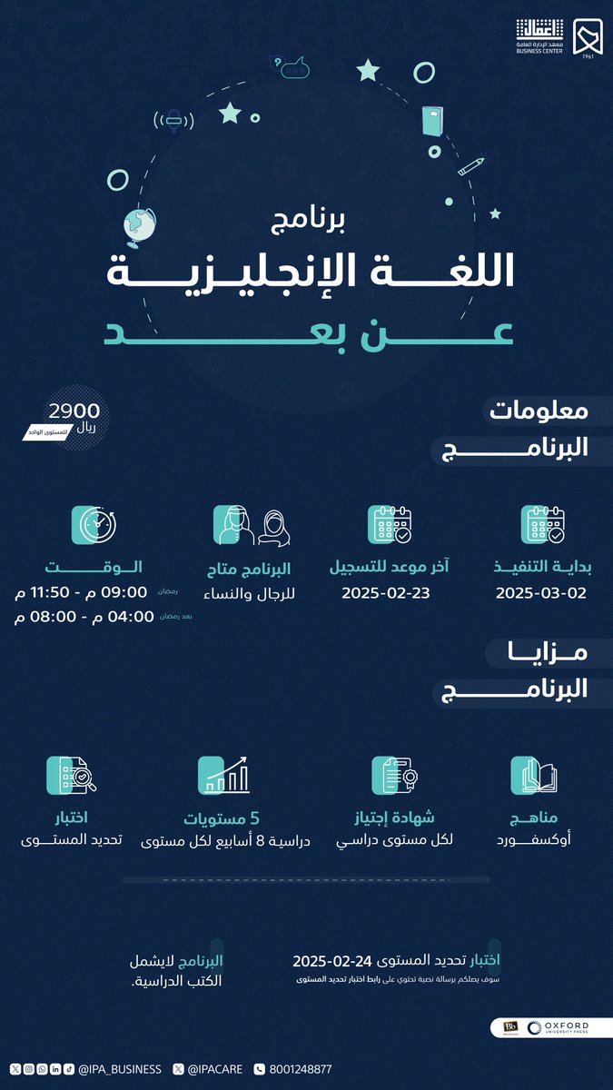 اعلن معهد الإدارة العامة عن فتح باب التسجيل في برنامج اللغة الإنجليزية (عن بُعد)، وذلك وفقاً للتفاصيل الموضحة أدناه.