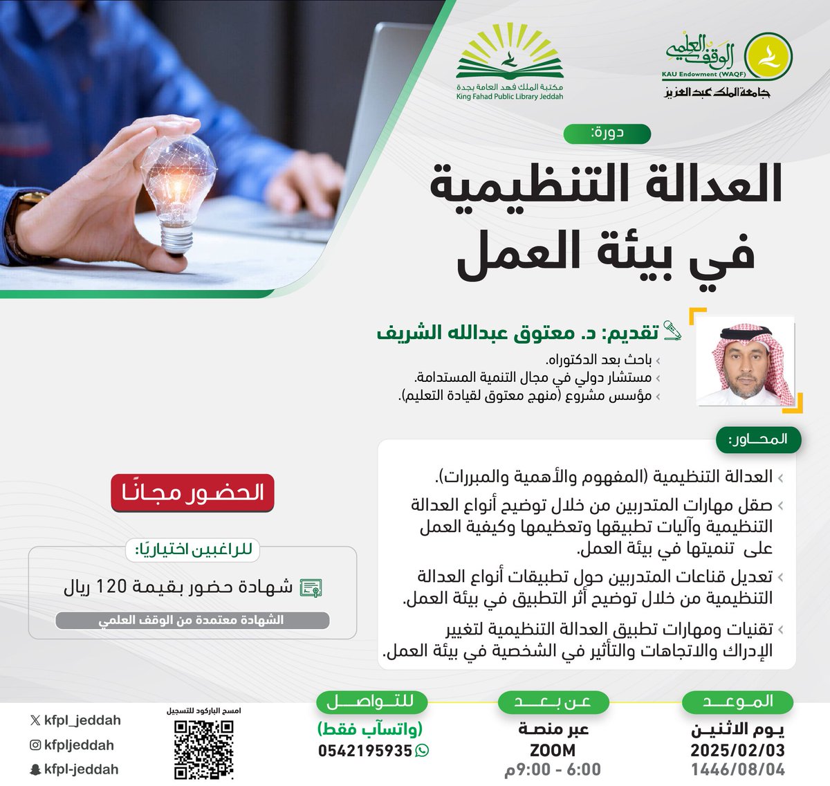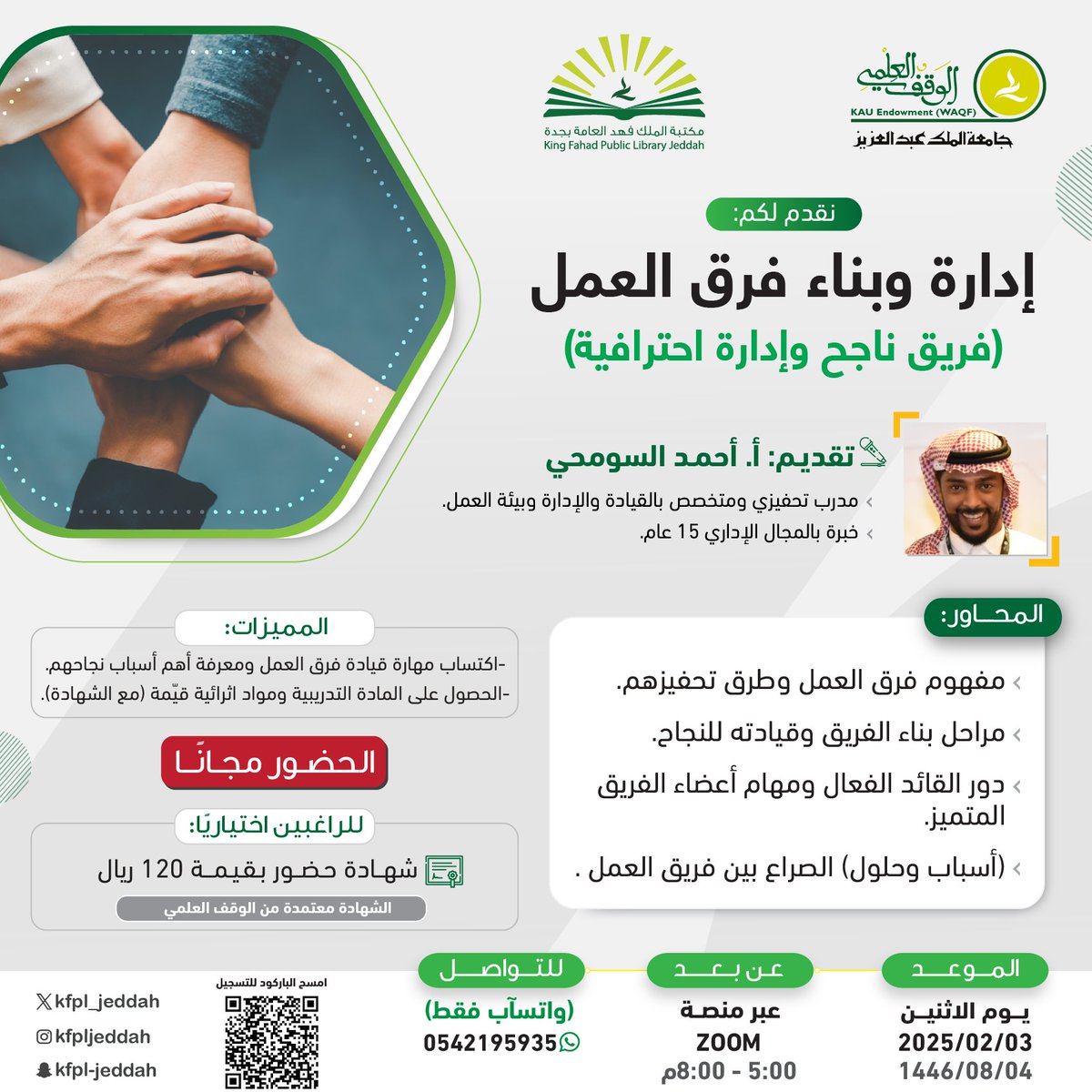 مكتبة الملك فهد العامة بجدة عن إقامة 13 دورة تدريبية (عن بُعد) بعدة مجالات، وسوف يكون حضور الدورة (مجاني)، والشهادة (اختيارية برسوم)، وذلك وفقاً للتفاصيل الموضحة أدناه.