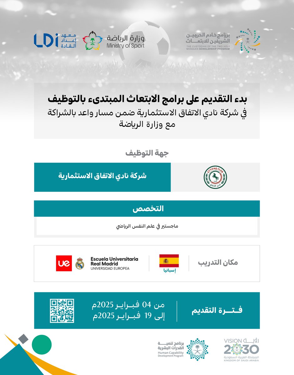 اعلن برنامج خادم الحرمين الشريفين للابتعاث عن فتح باب التقديم على برنامج الابتعاث المبتدئ بالتوظيف المقدم من شركة نادي الاتفاق الاستثمارية ضمن مسار واعد أحد مسارات برنامج خادم الحرمين الشريفين للابتعاث الخارجي وذلك بالتعاون مع وزارة الرياضة، وذلك وفقاً للتفاصيل الموضحة أدناه.