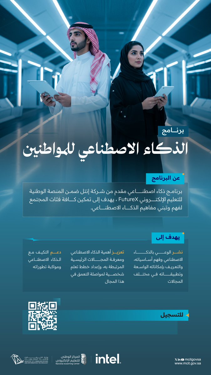 اعلنت وزارة الاتصالات وتقنية المعلومات بالتعاون مع شركة إنتل والمنصة الوطنية للتعليم الإلكتروني FutureX، عن إطلاق برنامج (الذكاء الاصطناعي للمواطنين) المجاني (عن بُعد). يهدف البرنامج لرفع مستوى الوعي العام بأساسيات الذكاء الاصطناعي وتطبيقاته وتأثيراته في الحياة اليومية، وذلك وفقاً للتفاصيل الموضحة أدناه.