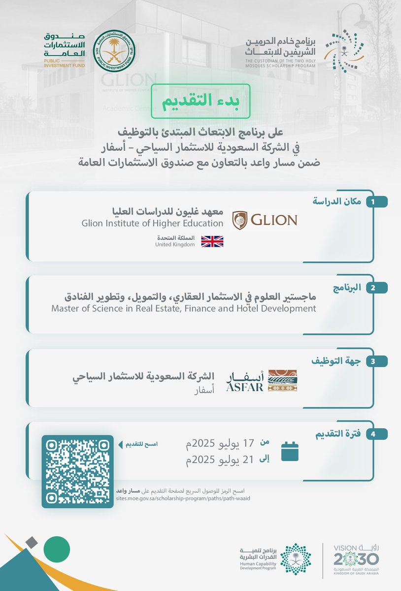 اعلن برنامج خادم الحرمين الشريفين للابتعاث بالتعاون مع صندوق الاستثمارات العامة والشركة السعودية للاستثمار السياحي (أسفار)، فتح باب التقديم في برنامج ابتعاث مبتدئ بالتوظيف ضمن مسار واعد، للحصول على درجة الماجستير في المملكة المتحدة، وذلك وفقاً للتفاصيل الموضحة أدناه.