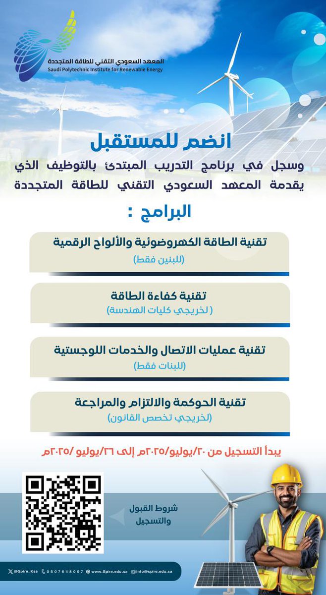 اعلن المعهد السعودي التقني للطاقة المتجددة (سباير) فتح باب التقديم في برامج التدريب المبتدئ بالتوظيف في مجالات الطاقة المتجددة، لتمكين الكوادر الوطنية من خلال برامج متخصصة تشمل مكافأة شهرية وعقد عمل، وذلك وفقاً للتفاصيل الموضحة أدناه.