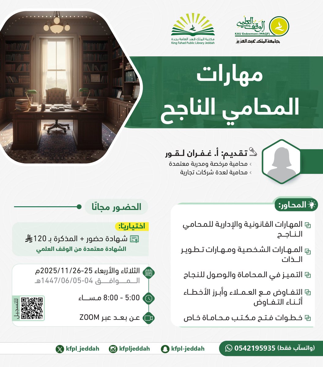 - الموعد: يوم الاثنين بتاريخ 1447/05/26هـ الموافق 2025/11/17م (من 4:00 إلى 5:30 مساءً).